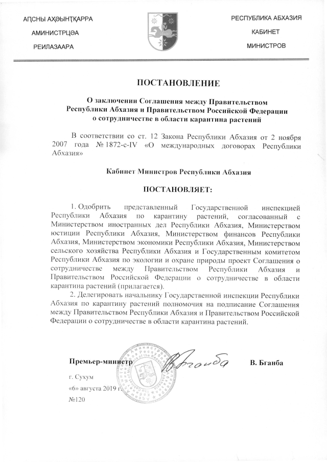 Постановление Кабинета Министров Республики Абхазия от 6.08.2019 №120 "О заключении Соглашения между Правительством Республики Абхазия и Правительством Российской Федерации о сотрудничестве в области карантина растений"