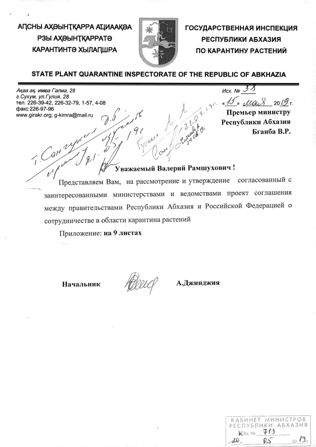 Постановление Кабинета Министров Республики Абхазия от 6.08.2019 №120 "О заключении Соглашения между Правительством Республики Абхазия и Правительством Российской Федерации о сотрудничестве в области карантина растений"
