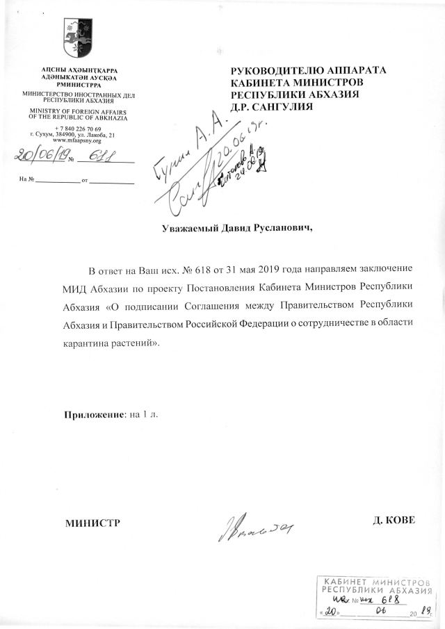 Постановление Кабинета Министров Республики Абхазия от 6.08.2019 №120 "О заключении Соглашения между Правительством Республики Абхазия и Правительством Российской Федерации о сотрудничестве в области карантина растений"