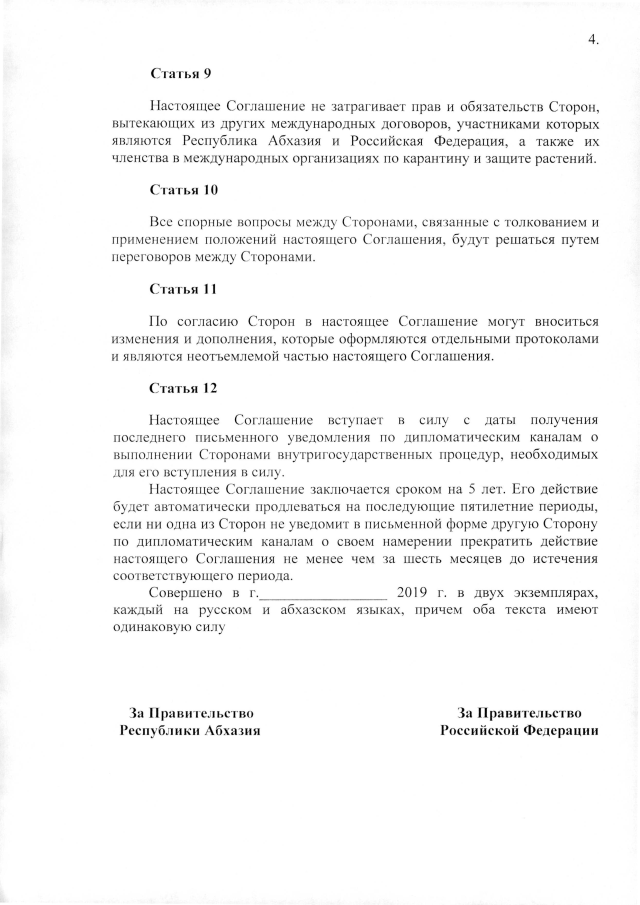 Постановление Кабинета Министров Республики Абхазия от 6.08.2019 №120 "О заключении Соглашения между Правительством Республики Абхазия и Правительством Российской Федерации о сотрудничестве в области карантина растений"