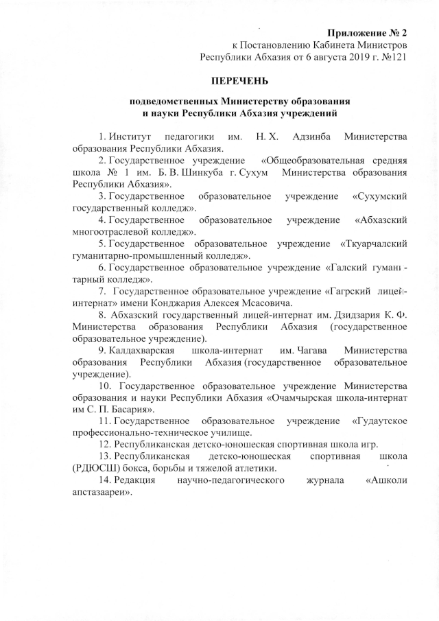 Постановление Кабинета Министров Республики Абхазия от 6.08.2019 №121 "Об утверждении Положения о Министерстве образования и науки Республики Абхазия"