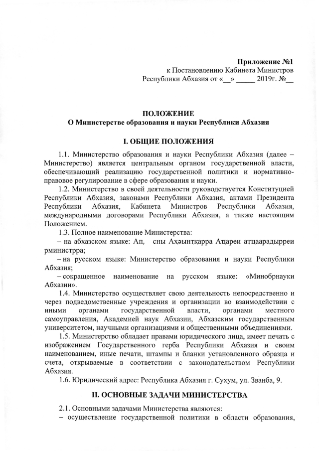 Постановление Кабинета Министров Республики Абхазия от 6.08.2019 №121 "Об утверждении Положения о Министерстве образования и науки Республики Абхазия"