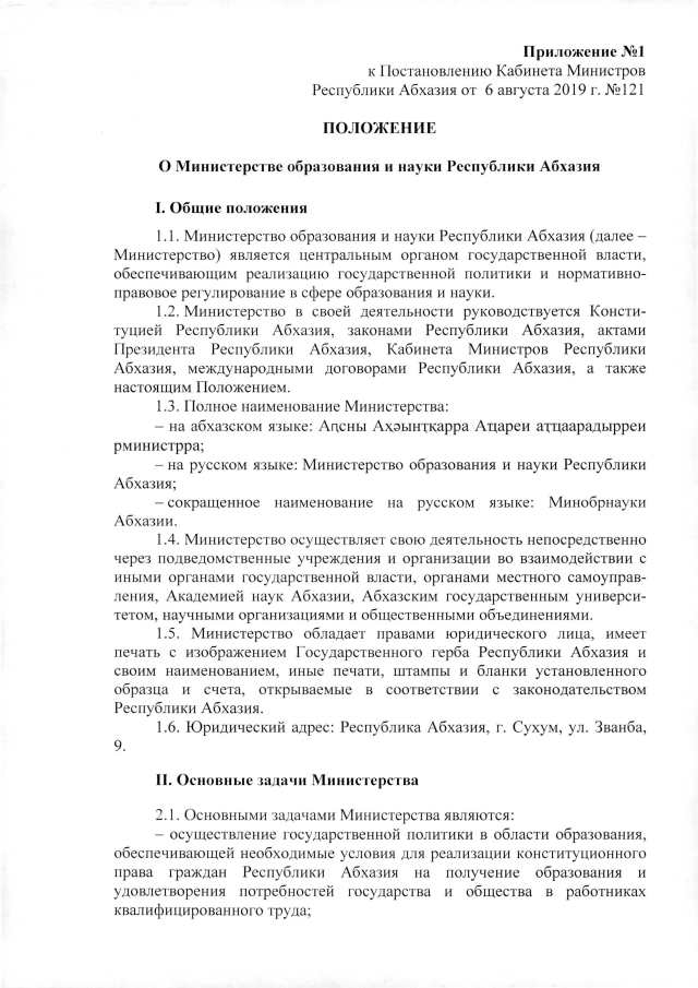 Постановление Кабинета Министров Республики Абхазия от 6.08.2019 №121 "Об утверждении Положения о Министерстве образования и науки Республики Абхазия"