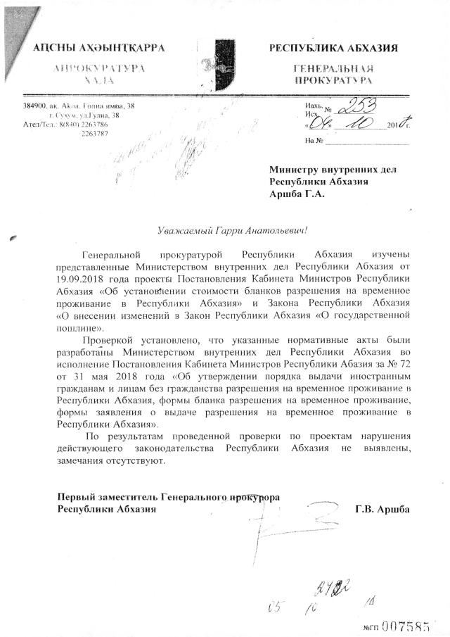 Постановление Кабинета Министров Республики Абхазия от 6.08.2019 №123 "Об установлении стоимости бланка разрешения на временное проживание в Республике Абхазия"