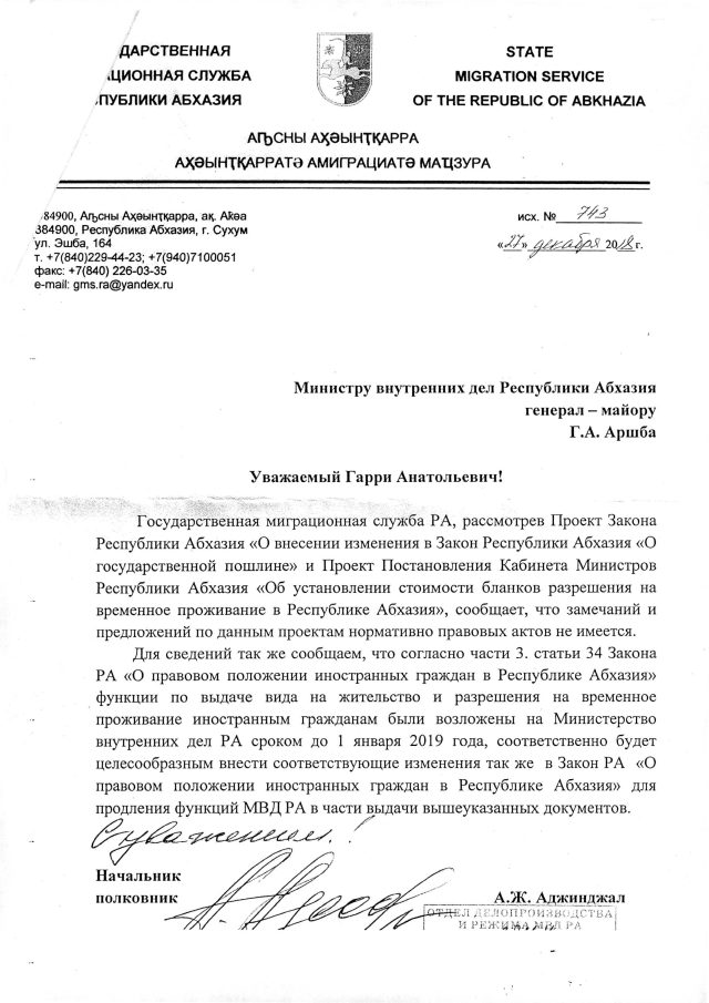 Постановление Кабинета Министров Республики Абхазия от 6.08.2019 №123 "Об установлении стоимости бланка разрешения на временное проживание в Республике Абхазия"
