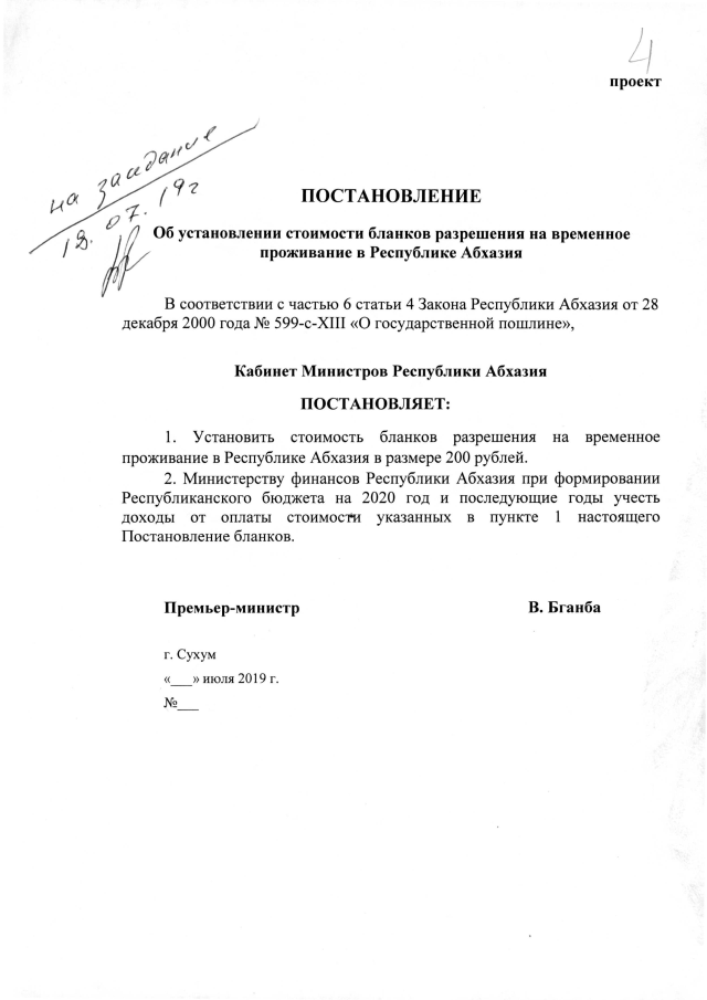 Постановление Кабинета Министров Республики Абхазия от 6.08.2019 №123 "Об установлении стоимости бланка разрешения на временное проживание в Республике Абхазия"