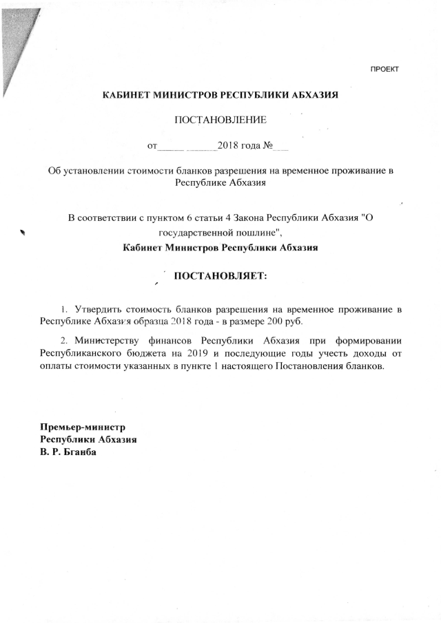 Постановление Кабинета Министров Республики Абхазия от 6.08.2019 №123 "Об установлении стоимости бланка разрешения на временное проживание в Республике Абхазия"