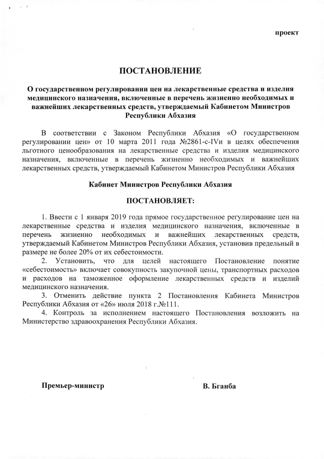 Постановление Кабинета Министров Республики Абхазия от 6.08.2019 №124 "Об утверждении Перечня жизненно необходимых и важнейших лекарственных средств"