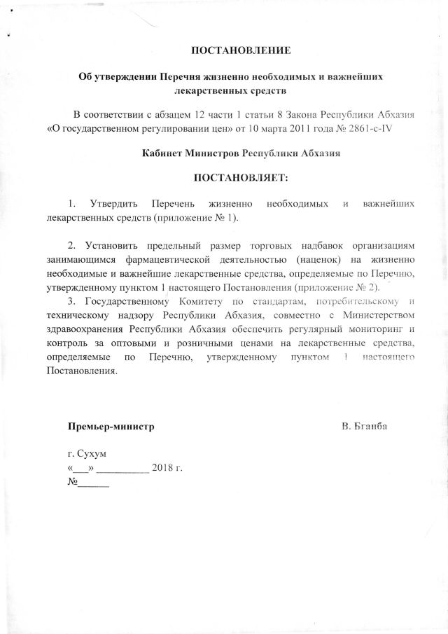 Постановление Кабинета Министров Республики Абхазия от 6.08.2019 №124 "Об утверждении Перечня жизненно необходимых и важнейших лекарственных средств"