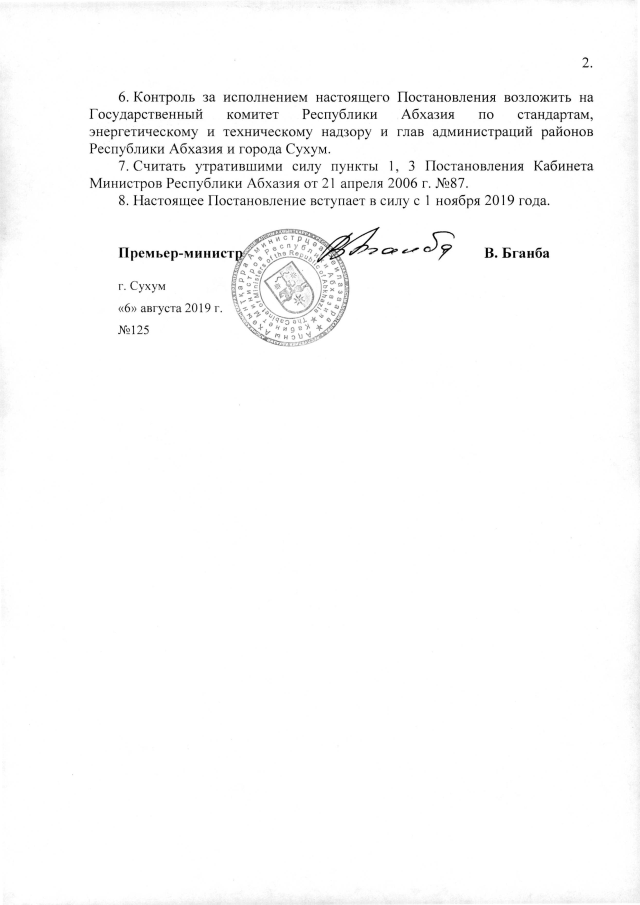 Постановление Кабинета Министров Республики Абхазия от 6.08.2019 №125 "Об утверждении Правил стандартизации средств размещения"
