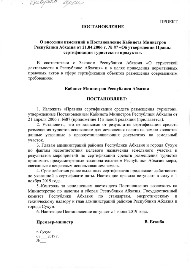 Постановление Кабинета Министров Республики Абхазия от 6.08.2019 №125 "Об утверждении Правил стандартизации средств размещения"