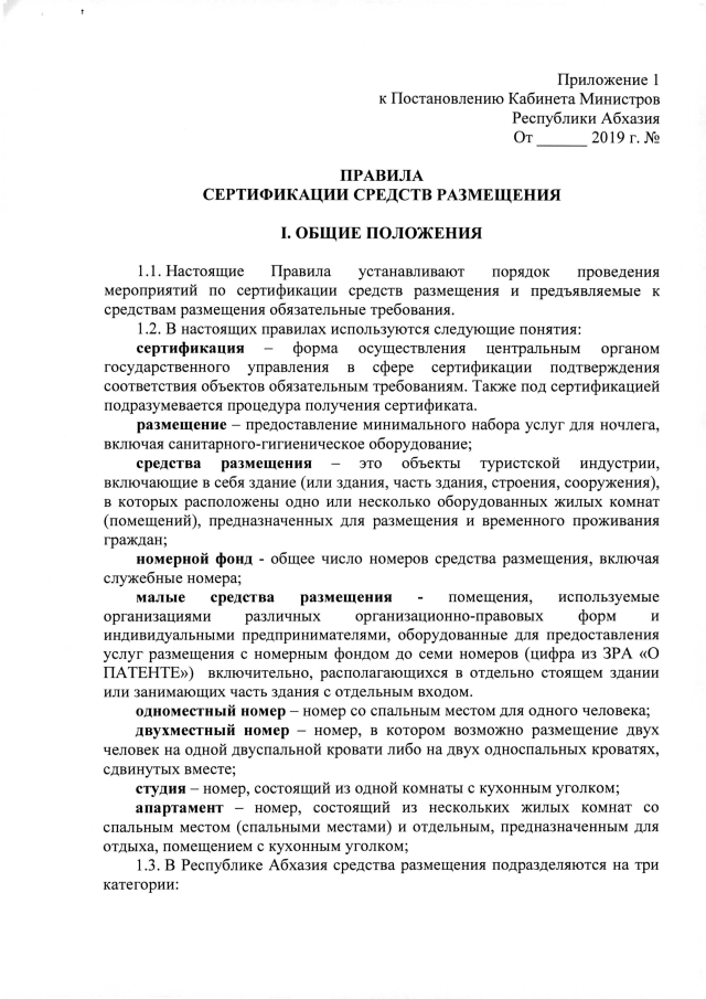 Постановление Кабинета Министров Республики Абхазия от 6.08.2019 №125 "Об утверждении Правил стандартизации средств размещения"