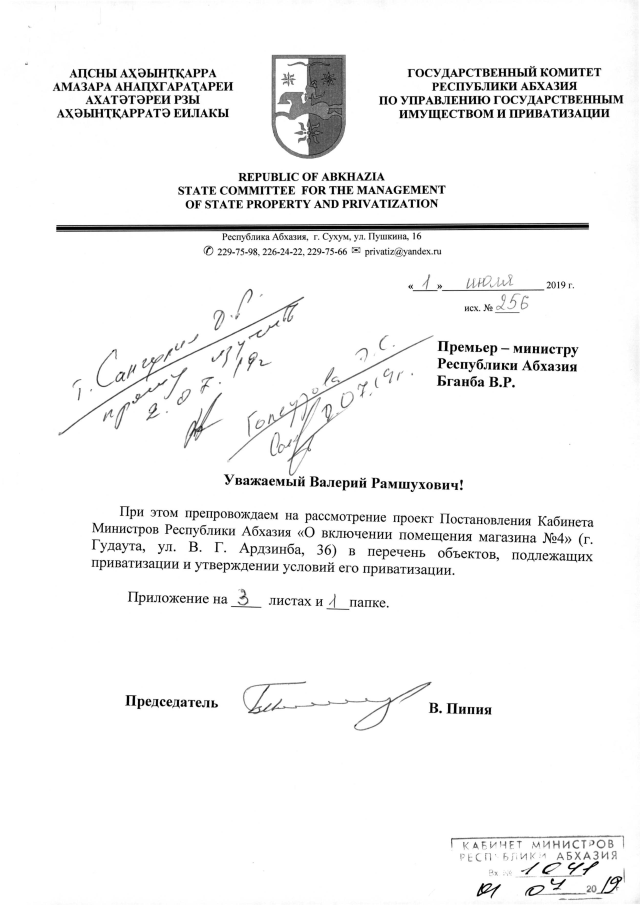 Постановление Кабинета Министров Республики Абхазия от 6.08.2019 №126 "О включении помещения магазина №4 (г. Гудаута, ул. В. Г. Ардзинба, 36) и здания ДСК (г. Гагра, ул. Русских Добровольцев, 11) в перечень объектов, подлежащих приватизации, и утверждении условий их приватизации "