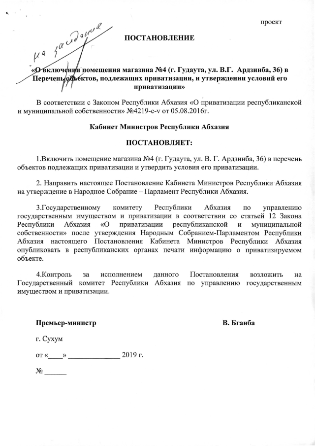 Постановление Кабинета Министров Республики Абхазия от 6.08.2019 №126 "О включении помещения магазина №4 (г. Гудаута, ул. В. Г. Ардзинба, 36) и здания ДСК (г. Гагра, ул. Русских Добровольцев, 11) в перечень объектов, подлежащих приватизации, и утверждении условий их приватизации "