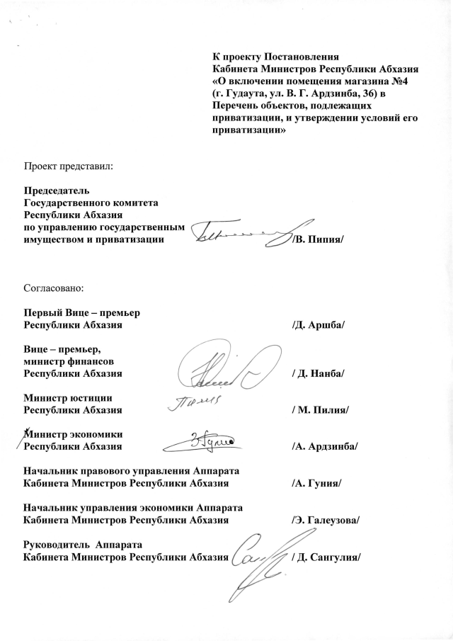 Постановление Кабинета Министров Республики Абхазия от 6.08.2019 №126 "О включении помещения магазина №4 (г. Гудаута, ул. В. Г. Ардзинба, 36) и здания ДСК (г. Гагра, ул. Русских Добровольцев, 11) в перечень объектов, подлежащих приватизации, и утверждении условий их приватизации "