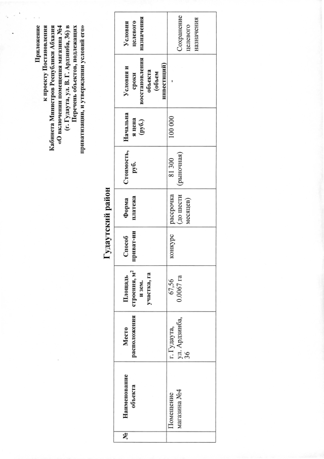 Постановление Кабинета Министров Республики Абхазия от 6.08.2019 №126 "О включении помещения магазина №4 (г. Гудаута, ул. В. Г. Ардзинба, 36) и здания ДСК (г. Гагра, ул. Русских Добровольцев, 11) в перечень объектов, подлежащих приватизации, и утверждении условий их приватизации "
