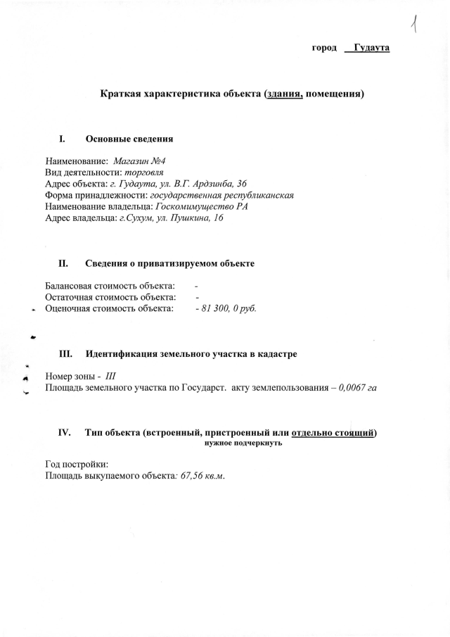 Постановление Кабинета Министров Республики Абхазия от 6.08.2019 №126 "О включении помещения магазина №4 (г. Гудаута, ул. В. Г. Ардзинба, 36) и здания ДСК (г. Гагра, ул. Русских Добровольцев, 11) в перечень объектов, подлежащих приватизации, и утверждении условий их приватизации "