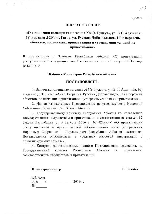 Постановление Кабинета Министров Республики Абхазия от 6.08.2019 №126 "О включении помещения магазина №4 (г. Гудаута, ул. В. Г. Ардзинба, 36) и здания ДСК (г. Гагра, ул. Русских Добровольцев, 11) в перечень объектов, подлежащих приватизации, и утверждении условий их приватизации "