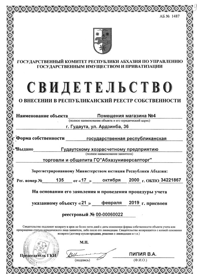 Постановление Кабинета Министров Республики Абхазия от 6.08.2019 №126 "О включении помещения магазина №4 (г. Гудаута, ул. В. Г. Ардзинба, 36) и здания ДСК (г. Гагра, ул. Русских Добровольцев, 11) в перечень объектов, подлежащих приватизации, и утверждении условий их приватизации "