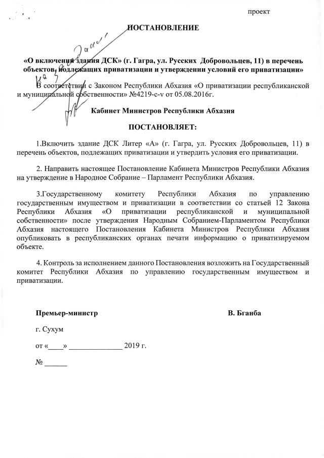 Постановление Кабинета Министров Республики Абхазия от 6.08.2019 №126 "О включении помещения магазина №4 (г. Гудаута, ул. В. Г. Ардзинба, 36) и здания ДСК (г. Гагра, ул. Русских Добровольцев, 11) в перечень объектов, подлежащих приватизации, и утверждении условий их приватизации "