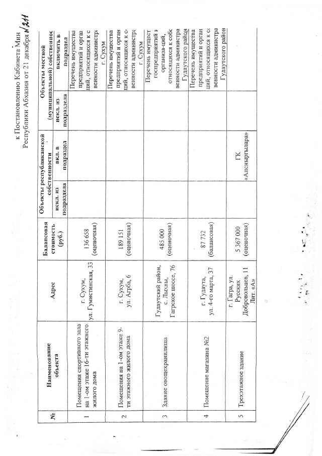 Постановление Кабинета Министров Республики Абхазия от 6.08.2019 №126 "О включении помещения магазина №4 (г. Гудаута, ул. В. Г. Ардзинба, 36) и здания ДСК (г. Гагра, ул. Русских Добровольцев, 11) в перечень объектов, подлежащих приватизации, и утверждении условий их приватизации "