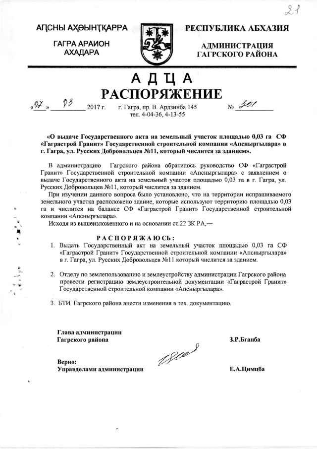 Постановление Кабинета Министров Республики Абхазия от 6.08.2019 №126 "О включении помещения магазина №4 (г. Гудаута, ул. В. Г. Ардзинба, 36) и здания ДСК (г. Гагра, ул. Русских Добровольцев, 11) в перечень объектов, подлежащих приватизации, и утверждении условий их приватизации "