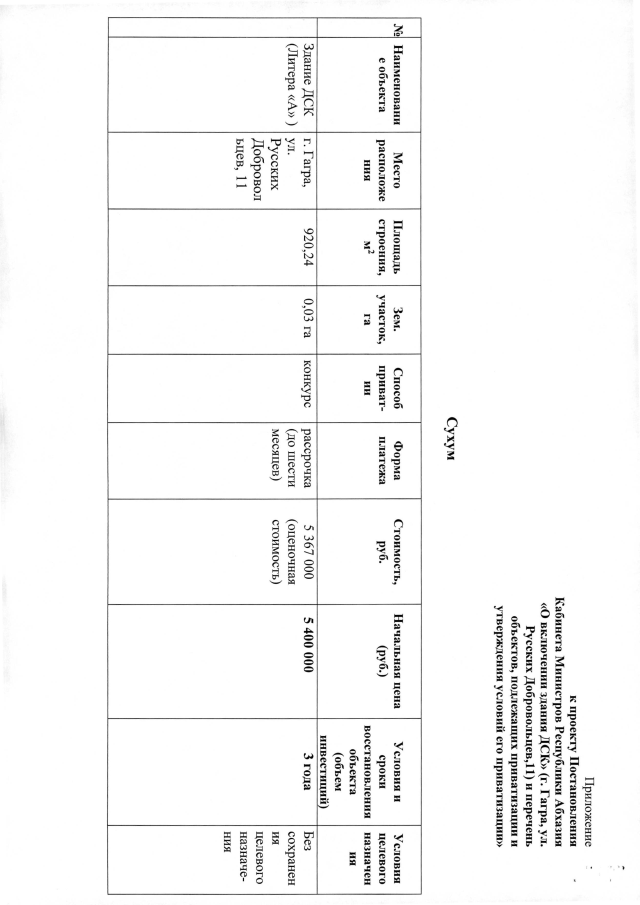 Постановление Кабинета Министров Республики Абхазия от 6.08.2019 №126 "О включении помещения магазина №4 (г. Гудаута, ул. В. Г. Ардзинба, 36) и здания ДСК (г. Гагра, ул. Русских Добровольцев, 11) в перечень объектов, подлежащих приватизации, и утверждении условий их приватизации "