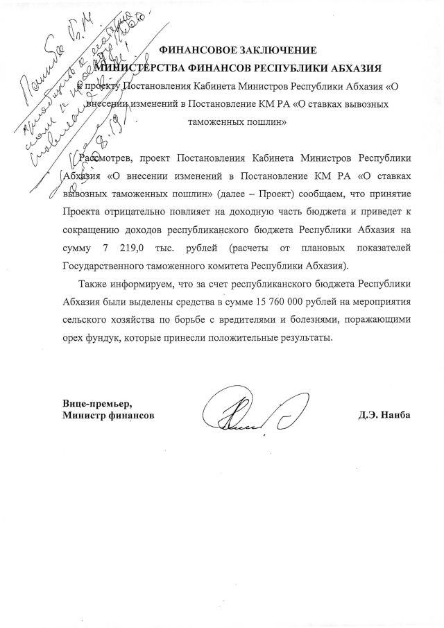 Постановление Кабинета Министров Республики Абхазия от 15.08.2019 №128 "О внесении изменений в Постановление Кабинета Министров Республики Абхазии от 30.06.2003 г. №291 "О ставках вывозных таможенных пошлин""