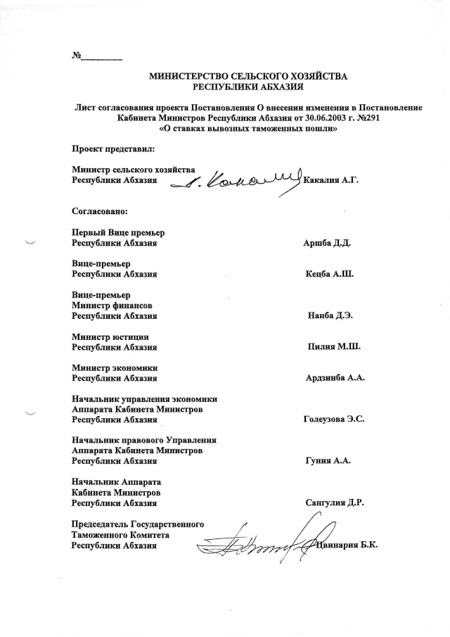 Постановление Кабинета Министров Республики Абхазия от 15.08.2019 №128 "О внесении изменений в Постановление Кабинета Министров Республики Абхазии от 30.06.2003 г. №291 "О ставках вывозных таможенных пошлин""