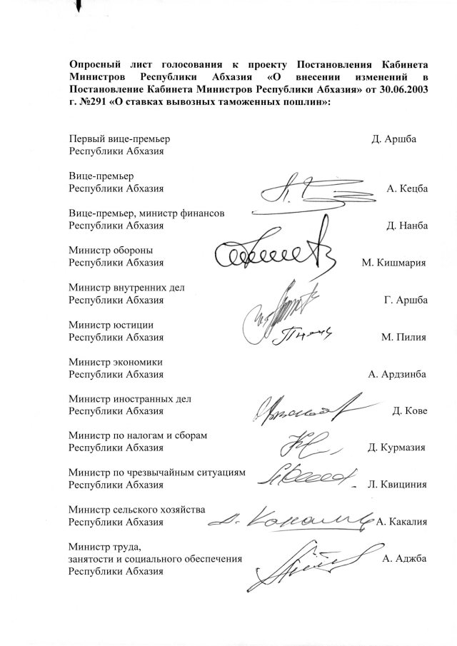 Постановление Кабинета Министров Республики Абхазия от 15.08.2019 №128 "О внесении изменений в Постановление Кабинета Министров Республики Абхазии от 30.06.2003 г. №291 "О ставках вывозных таможенных пошлин""