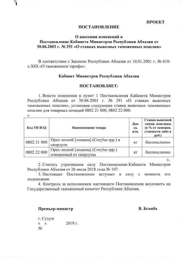 Постановление Кабинета Министров Республики Абхазия от 15.08.2019 №128 "О внесении изменений в Постановление Кабинета Министров Республики Абхазии от 30.06.2003 г. №291 "О ставках вывозных таможенных пошлин""