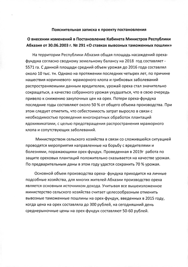 Постановление Кабинета Министров Республики Абхазия от 15.08.2019 №128 "О внесении изменений в Постановление Кабинета Министров Республики Абхазии от 30.06.2003 г. №291 "О ставках вывозных таможенных пошлин""