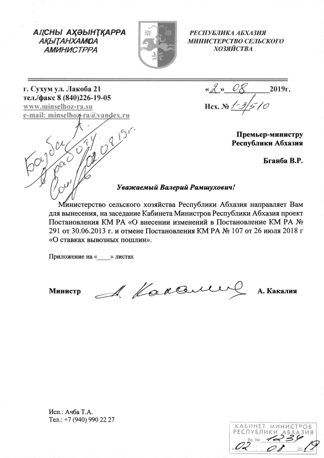 Постановление Кабинета Министров Республики Абхазия от 15.08.2019 №128 "О внесении изменений в Постановление Кабинета Министров Республики Абхазии от 30.06.2003 г. №291 "О ставках вывозных таможенных пошлин""