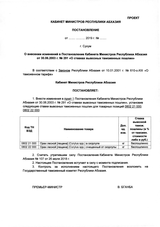Постановление Кабинета Министров Республики Абхазия от 15.08.2019 №128 "О внесении изменений в Постановление Кабинета Министров Республики Абхазии от 30.06.2003 г. №291 "О ставках вывозных таможенных пошлин""
