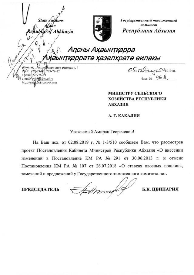 Постановление Кабинета Министров Республики Абхазия от 15.08.2019 №128 "О внесении изменений в Постановление Кабинета Министров Республики Абхазии от 30.06.2003 г. №291 "О ставках вывозных таможенных пошлин""