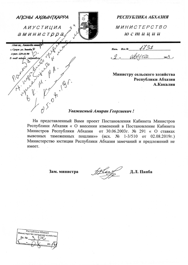 Постановление Кабинета Министров Республики Абхазия от 15.08.2019 №128 "О внесении изменений в Постановление Кабинета Министров Республики Абхазии от 30.06.2003 г. №291 "О ставках вывозных таможенных пошлин""