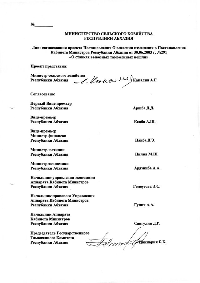 Постановление Кабинета Министров Республики Абхазия от 15.08.2019 №128 "О внесении изменений в Постановление Кабинета Министров Республики Абхазии от 30.06.2003 г. №291 "О ставках вывозных таможенных пошлин""