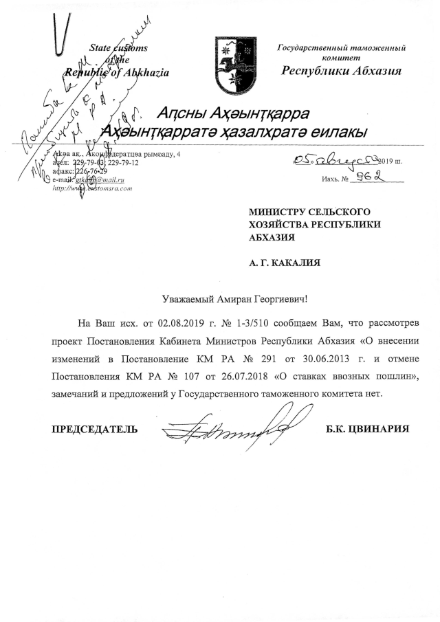 Постановление Кабинета Министров Республики Абхазия от 15.08.2019 №128 "О внесении изменений в Постановление Кабинета Министров Республики Абхазии от 30.06.2003 г. №291 "О ставках вывозных таможенных пошлин""