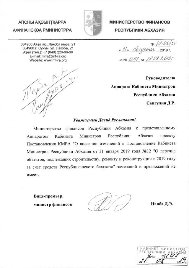 Постановление Кабинета Министров Республики Абхазия от 21.08.2019 №129 "О внесении изменений в Постановление Кабинета Министров Республики Абхазия от 31 января 2019 года №12 "О Перечне объектов, подлежащих строительству, ремонту и реконструкции в 2019 году за счет средств Республиканского бюджета"