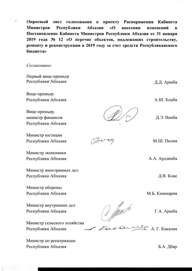 Постановление Кабинета Министров Республики Абхазия от 21.08.2019 №129 "О внесении изменений в Постановление Кабинета Министров Республики Абхазия от 31 января 2019 года №12 "О Перечне объектов, подлежащих строительству, ремонту и реконструкции в 2019 году за счет средств Республиканского бюджета"