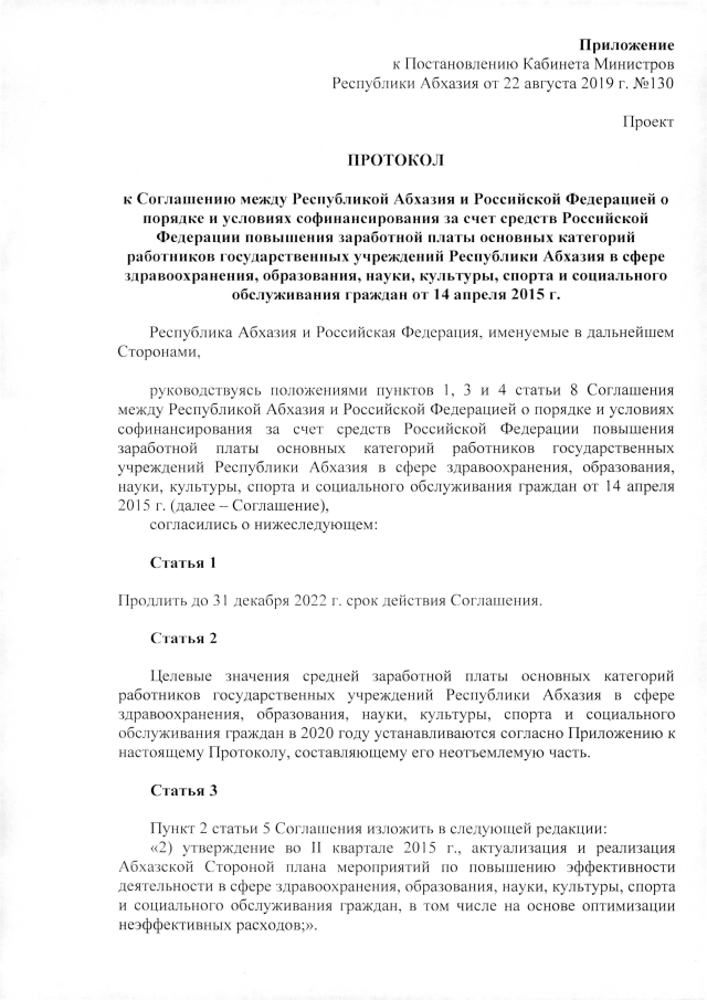 Постановление Кабинета Министров Республики Абхазия от 22.08.2019 №130 "О проекте Протокола к Соглашению между Республикой Абхазии и Российской Федерацией о порядке и условиях софинансирования за счет средств Российской Федерации повышения заработной платы основных категорий работников государственных учреждений Республики Абхазия в сфере здравоохранения, образования, науки, культуры, спорта и социального обслуживания граждан от 14 апреля 2015 года"