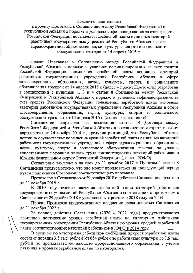Постановление Кабинета Министров Республики Абхазия от 22.08.2019 №130 "О проекте Протокола к Соглашению между Республикой Абхазии и Российской Федерацией о порядке и условиях софинансирования за счет средств Российской Федерации повышения заработной платы основных категорий работников государственных учреждений Республики Абхазия в сфере здравоохранения, образования, науки, культуры, спорта и социального обслуживания граждан от 14 апреля 2015 года"
