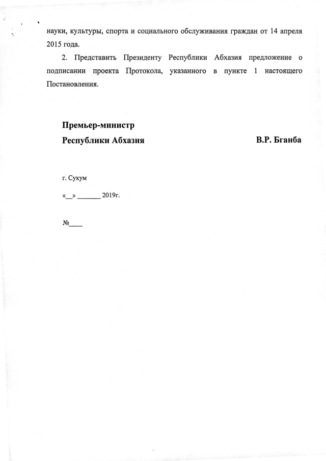 Постановление Кабинета Министров Республики Абхазия от 22.08.2019 №130 "О проекте Протокола к Соглашению между Республикой Абхазии и Российской Федерацией о порядке и условиях софинансирования за счет средств Российской Федерации повышения заработной платы основных категорий работников государственных учреждений Республики Абхазия в сфере здравоохранения, образования, науки, культуры, спорта и социального обслуживания граждан от 14 апреля 2015 года"