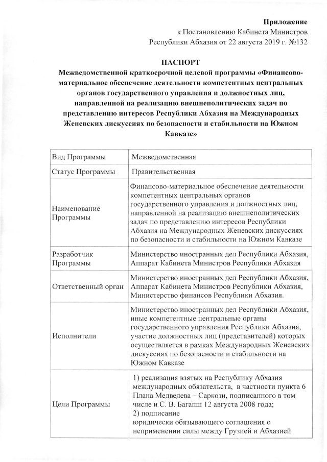 Постановление Кабинета Министров Республики Абхазия от 22.08.2019 №132 "Об утверждении Межведомственной краткосрочной целевой программы "Финансово-материальное обеспечение деятельности компетентных центральных органов государственного управления и должностных лиц, направленной на реализацию внешнеполитических задач по представлению интересов Республики Абхазия на Международных Женевских дискуссиях по безопасности и стабильности на Южном Кавказе""