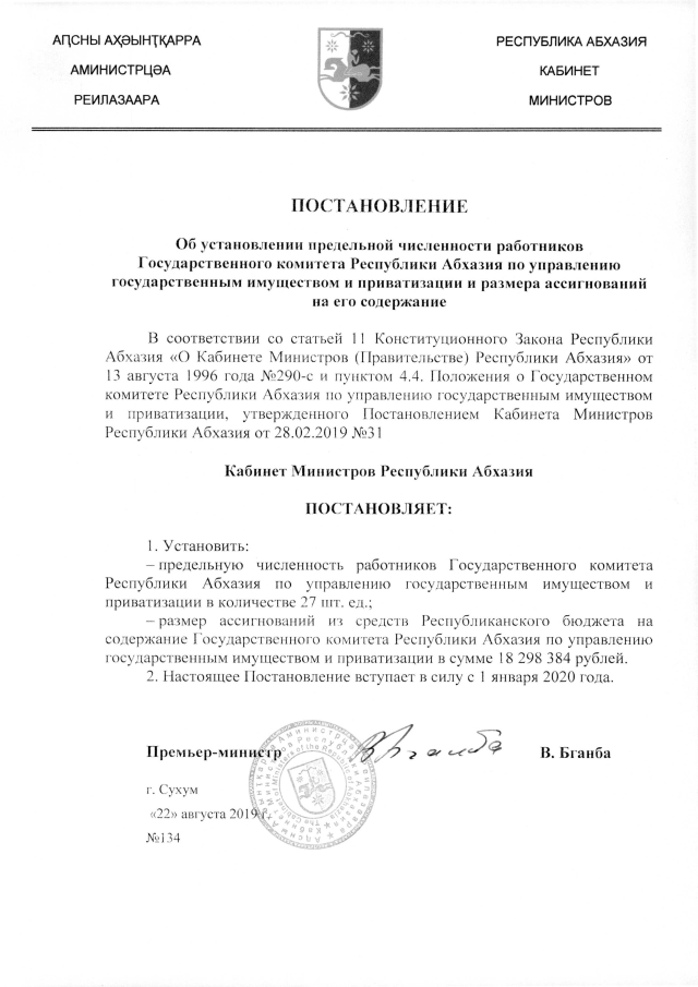 Постановление Кабинета Министров Республики Абхазия от 22.08.2019 №134 "Об установлении предельной численности работников Государственного комитета Республики Абхазия по управлению государственным имуществом и приватизации и размера ассигнований на его содержание"