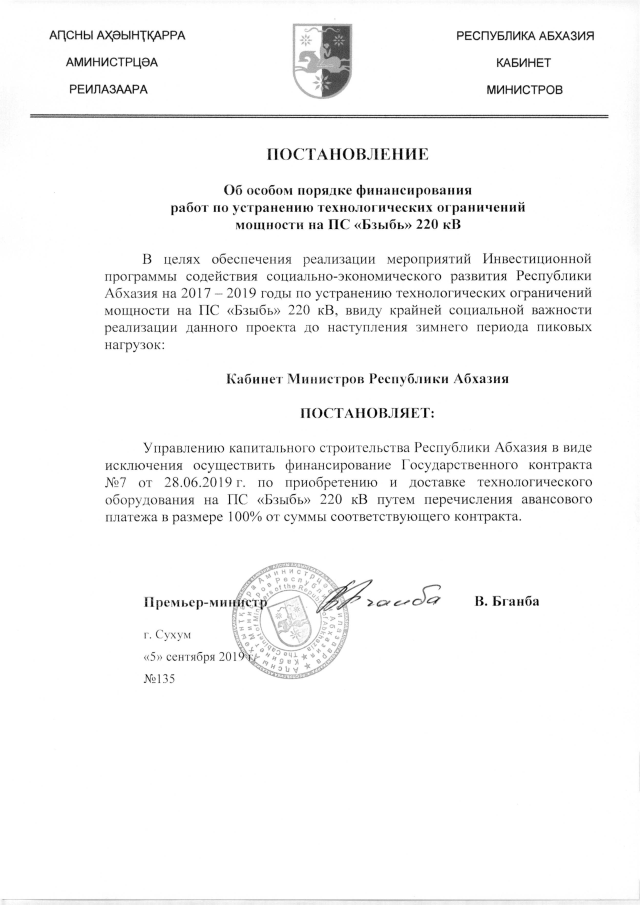 Постановление Кабинета Министров Республики Абхазия от 05.09.2019 №135 "Об особом порядке финансирования работ по устранению технологических ограничений мощности на ПС "Бзыбь" 220 кВ"