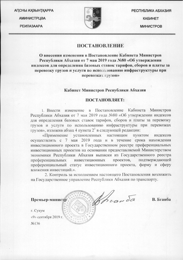 Постановление Кабинета Министров Республики Абхазия от 09.09.2019 №136 "О внесении изменении в Постановление Кабинета Министров Республики Абхазия от 7 мая 2019 года №80 "Об утверждении индексов для определения базовых ставок тарифов, сборов и платы за перевозку грузов и услуги по использованию инфраструктуры при перевозках грузов""