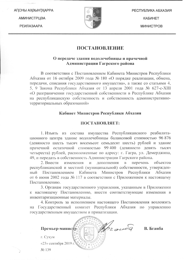 Постановление Кабинета Министров Республики Абхазия от 23.09.2019 №139 "О передаче здания водолечебницы и прачечной Администрации Гагрского района"
