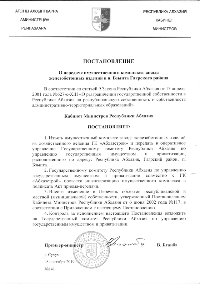 Постановление Кабинета Министров Республики Абхазия от 08.10.2019 №141 "О передаче имущественного комплекса завода железобетонных изделий в п. Бзыпта Гагрского района"