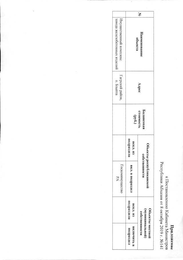 Постановление Кабинета Министров Республики Абхазия от 08.10.2019 №141 "О передаче имущественного комплекса завода железобетонных изделий в п. Бзыпта Гагрского района"